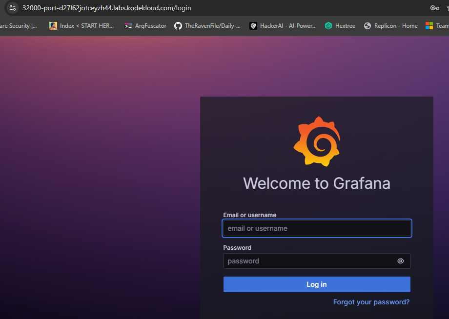 grafana-service NodePort 10.96.117.133 <none> 3000:32000/TCP 43s